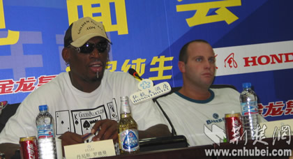 在記者會上,曾和喬丹、皮蓬一起被稱為“公牛鐵三角”、七屆NBA籃板的丹尼斯.羅德曼格外引人注目,記者圍繞著一些球迷感興趣的話題對他進行了采訪。當(dāng)有人問起他為什么在見面會上會這么平靜時,他的回答幽默又讓人充滿期待:這里有這么多的攝影機、照相機和記者朋友,施展不開,當(dāng)然要平靜。賽場上的我和此時的我完全不同,想看一個真正的羅德曼,明天去賽場吧。