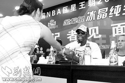 “大蟲”似乎不為所動(dòng),拿起行李,在保安的保護(hù)下向外走。記者們忙起來了,兩位來自電視臺(tái)娛樂頻道的記者拿著話筒,沖到羅德曼面前,踮起腳跟,不斷用英語發(fā)問。