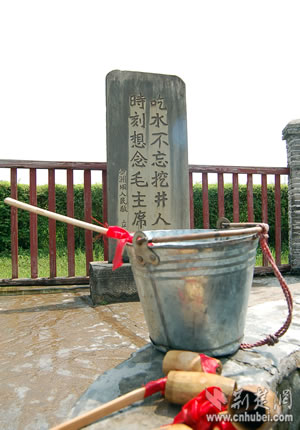 紅軍長征后,國民黨反動(dòng)派幾次把井填掉,群眾幾次把井挖開。幾填幾挖,激怒了反動(dòng)派,便下了一道挖井禁令:“誰挖井,誰殺頭!”1950年,沙洲壩人民為了迎接毛主席派來的南方老革命根據(jù)地慰問團(tuán),將這口井進(jìn)行了全面維修,并尊稱為“紅井”,在井旁立了一塊木牌,上書“吃水不忘挖井人,時(shí)刻想念毛主席”14個(gè)大字。后來又將木牌改為石碑,把“吃水不忘挖井人,時(shí)刻想念毛主席”14個(gè)大字涂上赤金。