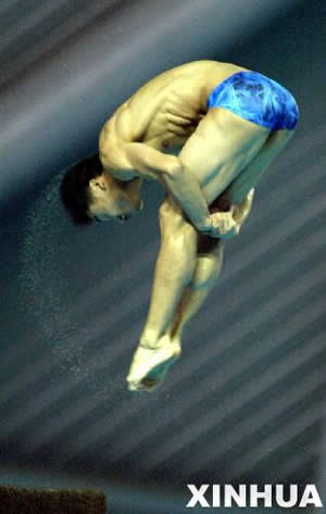 9月28日,陜西隊(duì)選手田亮在男團(tuán)十米跳臺的比賽中。最終,他以275.25分的成績獲得該項(xiàng)目第一名。當(dāng)日,在南京進(jìn)行的第十屆全國運(yùn)動會跳水男子團(tuán)體比賽中,陜西隊(duì)以2155.25分的總成績獲得銅牌。(新華社記者孟永民攝)