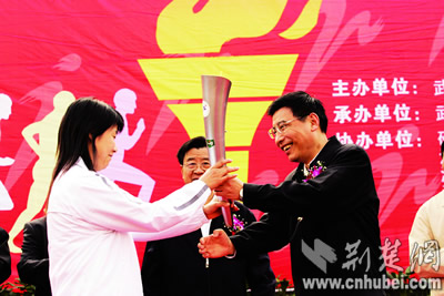 昨日8時30分許,硚口體育廣場彩旗飄揚、鑼鼓喧天。省委常委、武漢市委書記苗圩點燃武漢市第七屆運動會火種,交由奧運冠軍喬紅引燃各區(qū)火炬,領(lǐng)跑該市近5000人的火炬大傳遞。