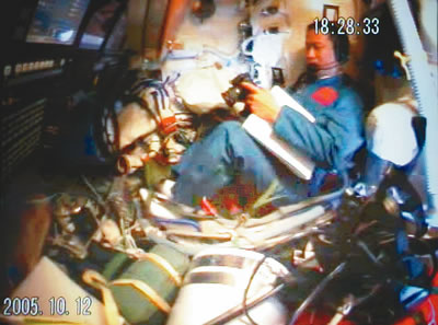 17時(shí)29分,航天員向地面飛控中心報(bào)告飛船工作正常,已做好開啟返回艙艙門的準(zhǔn)備。在得到地面指揮員的指令后,費(fèi)俊龍打開返回艙艙門,在聶海勝的幫助下進(jìn)入軌道艙工作。