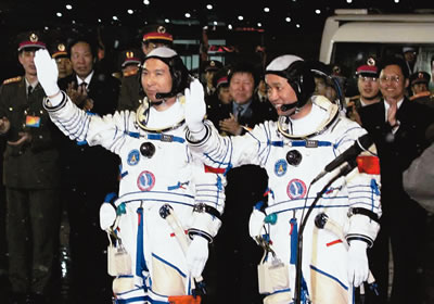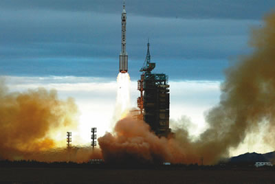 9時(shí)整,費(fèi)俊龍、聶海勝乘坐神舟六號(hào)飛船在長征火箭的托舉下,飛向太空。