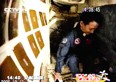 聶海勝正在進(jìn)行“穿艙”———從返回艙進(jìn)入軌道艙。
