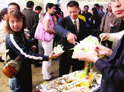 這個(gè)匠心獨(dú)運(yùn)的蛋糕由妞妞公司制作贈(zèng)送。其主體部分是一條飛龍,并書(shū)有“飛龍?jiān)谔臁弊謽。飛龍一側(cè),則是一只“神舟六號(hào)”航天飛船模型。