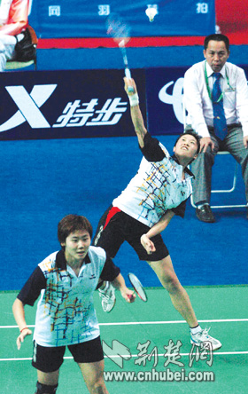 在江蘇昆山舉行的羽毛球女雙決賽中,湖北省的高崚/魏軼力面對(duì)雅典奧運(yùn)會(huì)冠軍組合———廣東的楊維/張潔雯,毫不手軟,以15:10、17:15直落兩局,爆了一個(gè)小小的冷門,為湖北羽毛球隊(duì)奪得唯一一枚金牌。