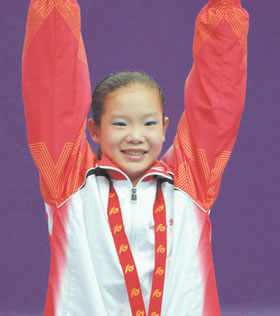 果不其然,在澎湃的音樂聲中,程菲以近乎完美的表演贏得了全場最高分——9.817分。賽后,程菲對自己的狀態(tài)和靚麗很滿意。省體操中心主任王沛笑著對記者說:“我感覺程菲像變了個人似的,有一種前所未有的自信!币荒昵暗某谭品浅D懬,與外界打交道時總是很沉默,王沛鼓勵她說:“你要多笑,笑起來才好看,觀眾和裁判才會喜歡你!币荒旰,程菲在金陵笑的格外甜!