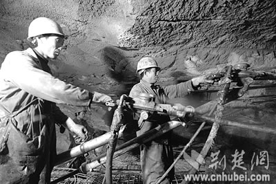 穿著雨衣的工人們手持風槍,正在腳手架上下打爆破眼,山體里的水嘩啦啦直往下噴,然后順著挖好的水槽排向洞外,最多時一天要排3000立方米!斑@水算小的!”也許是察覺出我們眼神里的擔心,包秀峰輕松笑笑,仿佛一切都在他們掌控中。他甚至調(diào)侃說,“瞧,我們都穿皮鞋上班,施工環(huán)境沒你們想象中那么艱難!