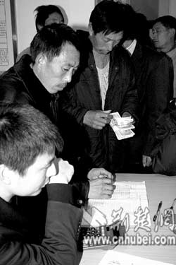 荊門麻城鎮(zhèn)譚珍國等農(nóng)民工,在天門市勞動(dòng)保障監(jiān)察大隊(duì)領(lǐng)取用人單位所欠的工資款(上圖)。去年12月以來,天門市組織有關(guān)職能部門對(duì)全市37家用人單位支付農(nóng)民工工資情況進(jìn)行專項(xiàng)檢查,共查出6家用人單位拖欠農(nóng)民工工資,他們及時(shí)為2056名農(nóng)民工追回工資180余萬元(下圖)。(特約記者肖金舫通訊員劉銀斌攝)