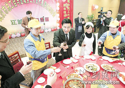 時近中午,江城煤氣、環(huán)衛(wèi)、紡織、搬運等行業(yè)的61名農民工,被省委常委、武漢市委書記苗圩請到了漢口新華家園三五酒店。