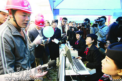 像譚梅一樣,昨天共有300多名農(nóng)民工涌到武漢市總工會(huì)大院,參加了在這里舉行的武漢市農(nóng)民工“平安返鄉(xiāng)”票務(wù)趕集會(huì)。在武漢市總工會(huì)組織下,漢口火車站、傅家坡長(zhǎng)途汽車站、武漢港務(wù)集團(tuán)客運(yùn)站等7家客運(yùn)單位,紛紛來(lái)到趕集會(huì)現(xiàn)場(chǎng),為農(nóng)民工提供熱情的票務(wù)服務(wù)。