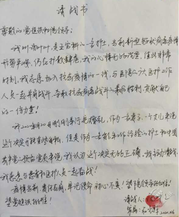 剛剛新婚,主動放棄婚假,遞交請戰(zhàn)書,請求奔赴抗疫前線,貢獻自己的一份力。市人民醫(yī)院預備黨員、護士湯葉葉在請戰(zhàn)書中這樣寫道:“疫情當前,責任在肩,牢記使命,初心不變!”