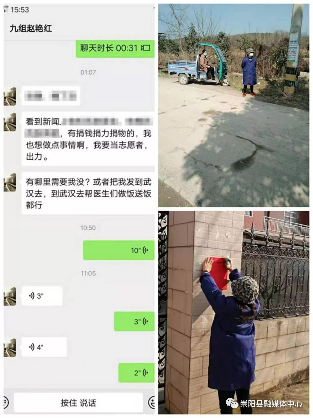 “有哪里需要我嗎?我要當志愿者,哪怕是到武漢去為醫(yī)生做飯送飯都行。”這是青山鎮(zhèn)城萬村九組村民趙艷紅2月2日凌晨1點,向村婦聯(lián)主席發(fā)出的“請戰(zhàn)”信息。