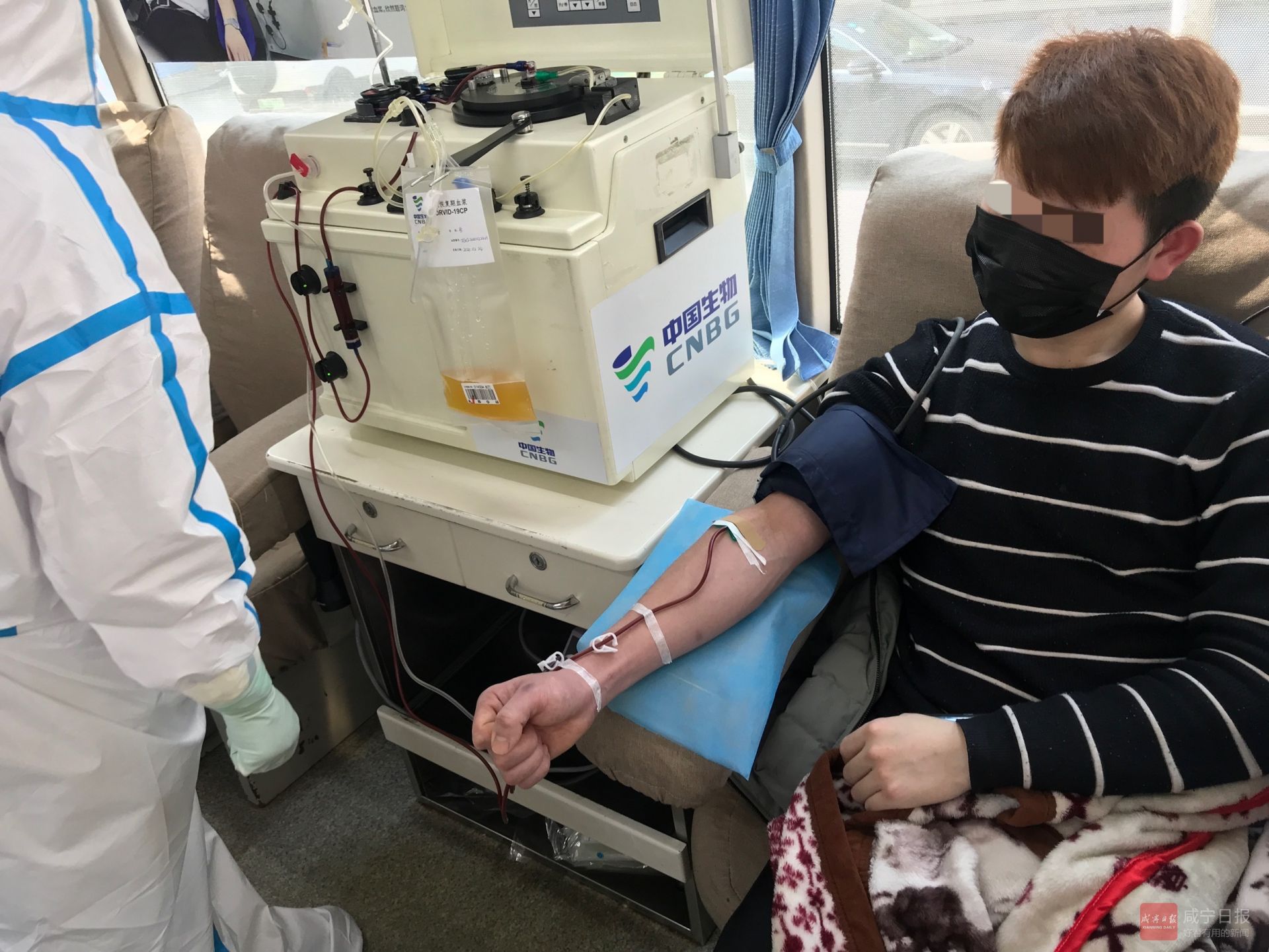 當(dāng)天,治愈患者程某在經(jīng)過CT、核酸檢測、體檢征詢等一系列操作后,在咸寧市中心血站流動采血車上接受了血漿采集,共400毫升。