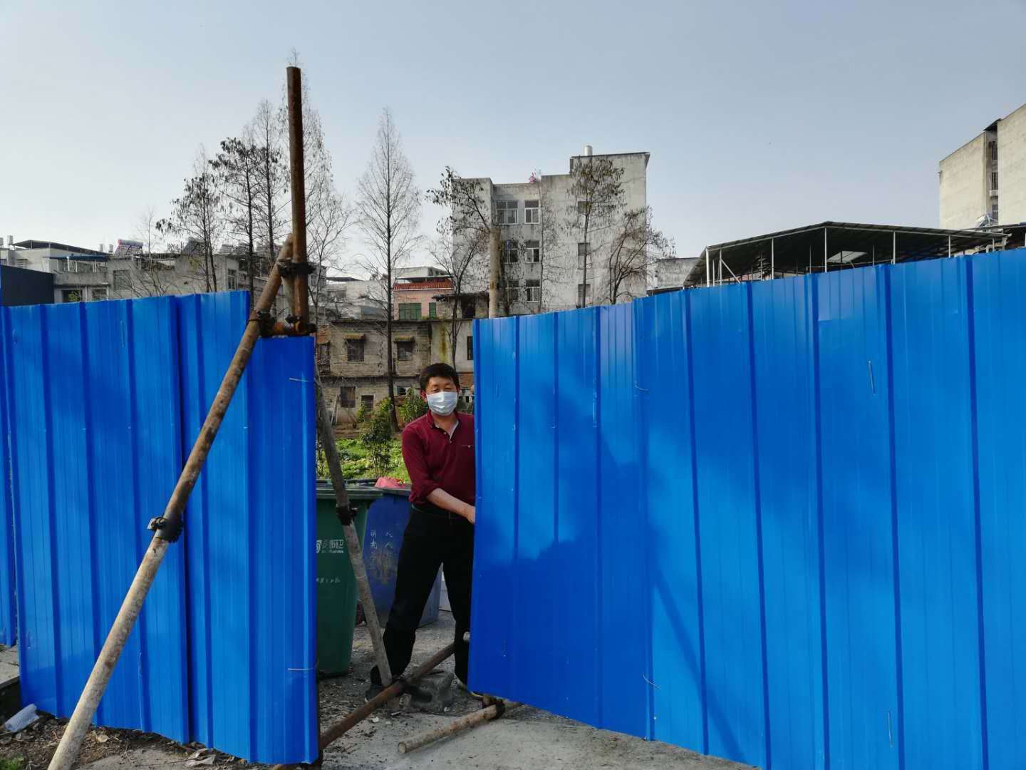 自臘月二十九日開始,村干部們帶頭上,購買了樹木、鐵皮,立樹樁,釘鐵皮墻。大道兩邊相向設(shè)置,從南門河四橋開始,一直到城內(nèi)小區(qū)。到大年三十晚上,兩道藍(lán)色的“屏障”悄悄立起,它們“環(huán)著村、環(huán)著城”,成為斬斷疫魔的“致命一招”。
