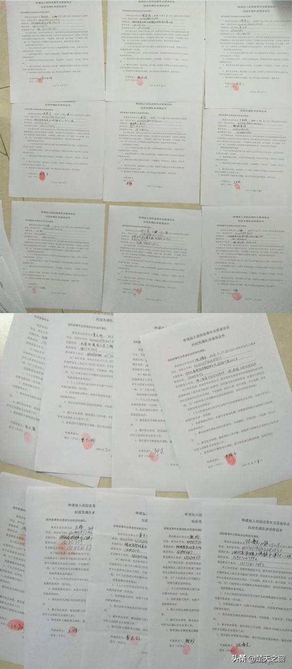 萬一感染了病毒怎么辦?早在成立崇陽縣青年志愿者協(xié)會抗疫先鋒隊(duì)時(shí),沈增平就第一個(gè)帶頭和隊(duì)員們一起簽下了承諾保證書“個(gè)人知悉所有風(fēng)險(xiǎn)和自愿承擔(dān)一切責(zé)任,抗疫值勤過程中,如果不幸感染病毒,積極接受和配合政府部門及醫(yī)院的隔離和治療;服從抗疫先鋒隊(duì)黨組織的領(lǐng)導(dǎo),不怕犧牲......”并按下了一個(gè)個(gè)鮮紅的手印。