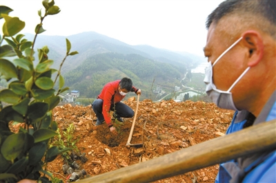 3月11日,通城縣直機(jī)關(guān)單位部分干部,戴著口罩開(kāi)展義務(wù)植樹(shù)活動(dòng)。