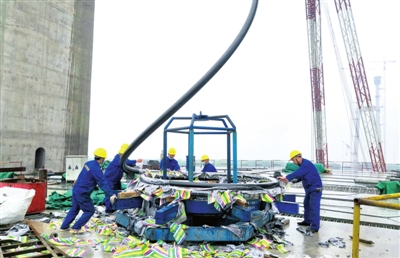 4月20日上午9時(shí)許,赤壁江畔,煙雨朦朧。隨著現(xiàn)場(chǎng)指揮人員一聲令下,塔吊吊鉤緩緩升空,一條長(zhǎng)96.492米,重達(dá)6.40噸的“長(zhǎng)龍”蜿蜒騰空而起,一端“穿針引線”地安裝在塔端1號(hào)索道管內(nèi)再脫空展索。