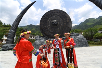 11日,通城縣大坪鄉(xiāng)內(nèi)沖瑤族村瑤望千年廣場,游客身著鮮艷服裝,開始錄制抖音。