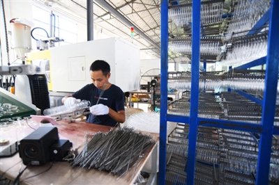 14日,通山縣經(jīng)濟開發(fā)區(qū)低碳產(chǎn)業(yè)園創(chuàng)盛光學有限公司,工人在眼鏡鏡片生產(chǎn)線上作業(yè)。