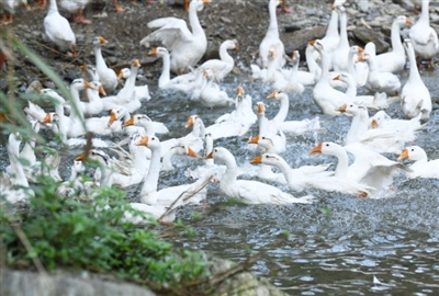 鵝苗在這里生活得確實(shí)挺好:樹林里“閑庭信步”,山泉水里沐浴嬉戲,每天都有鮮美的蟲草吃,夫妻倆每天還會(huì)給它們喂兩次玉米?;蚬攘?,所以,不到4個(gè)月,它們就長(zhǎng)到了十多斤。