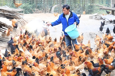 5日,崇陽縣天城鎮(zhèn)茅井村村民余達鑫在山林邊喂食土雞。