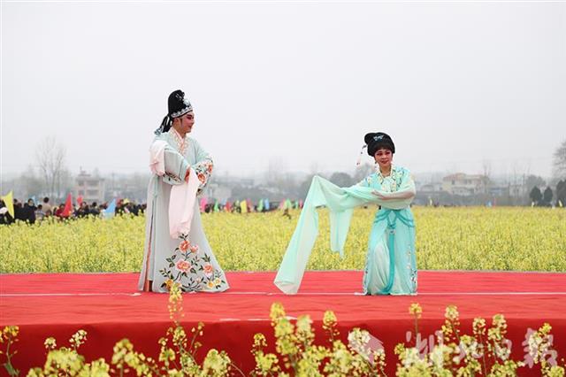 油菜花有普通的黃色、橙黃、桃紅、紫紅等顏色,游客擠在田埂上拍照。青山鎮(zhèn)在菜地里搭起了舞臺,舉辦首屆七彩油菜花節(jié)開幕式,提琴戲、腰鼓等好戲連臺,《我家在崇陽》歌聲在花海中回蕩。