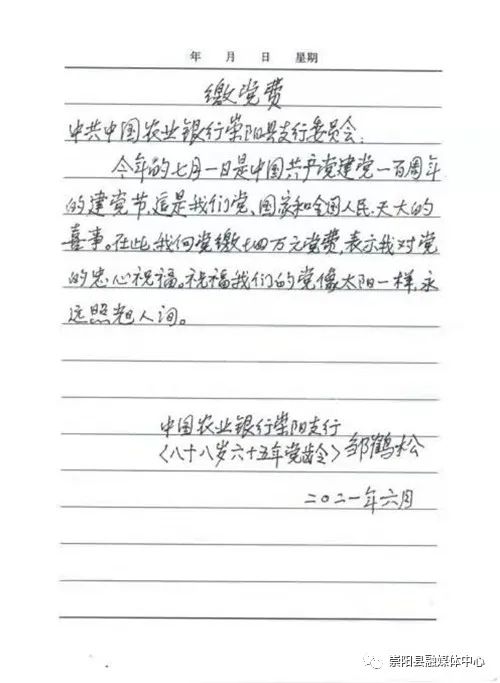 廖海峰告訴記者,來之前,鄒鶴松老人特意向中國農業(yè)銀行崇陽支行黨委寫了一封信,信里這樣寫著:“今年是中國共產黨建黨100周年,這是我們黨、國家和全國人民天大的喜事。在此,我向黨繳納4萬元黨費,表示我對黨的衷心祝福。祝福我們的黨像太陽一樣,永遠照耀人間。”一句句簡單樸實的語言,彰顯著一名老黨員赤心向黨、一心為黨樸實而偉大的情懷。
