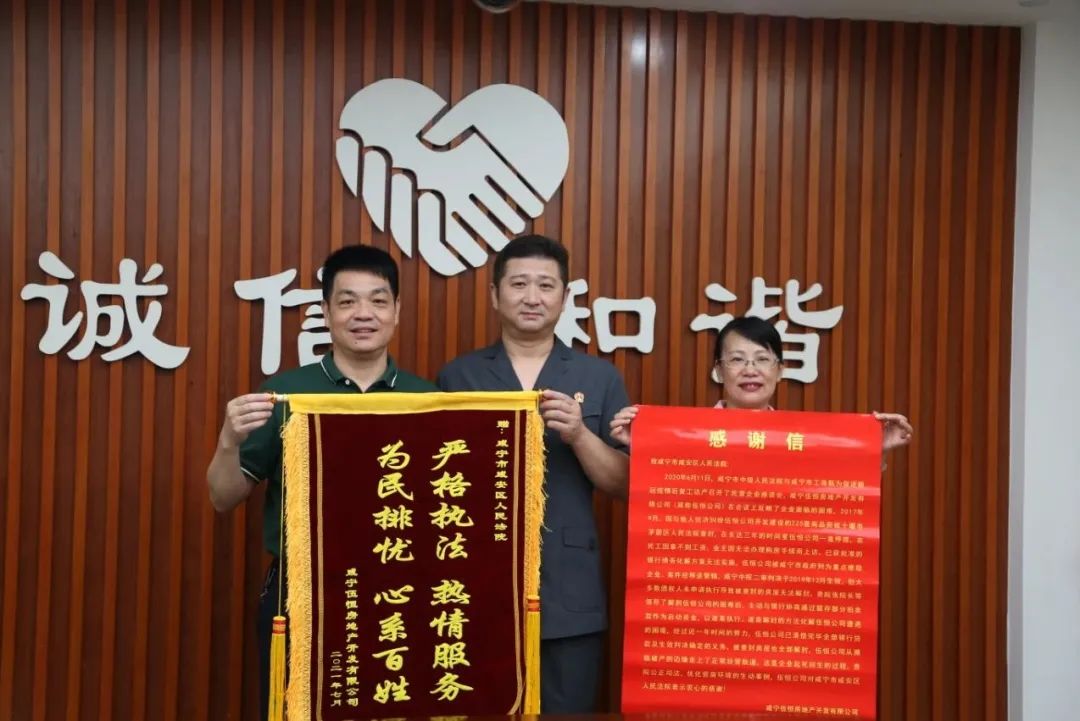 “感謝咸安區(qū)法院,讓我們公司從瀕臨破產(chǎn)的邊緣走回正常經(jīng)營的軌道,幫助我們起死回生......”7月16日下午,咸寧伍恒房地產(chǎn)開發(fā)有限公司(以下簡(jiǎn)稱伍恒公司)負(fù)責(zé)人將一面寫有“嚴(yán)格執(zhí)法,熱情服務(wù);為民排憂,心系百姓”的錦旗和一封感謝信送至咸安區(qū)法院,感謝區(qū)法院執(zhí)行局善意文明執(zhí)行,幫助企業(yè)渡過難關(guān)。