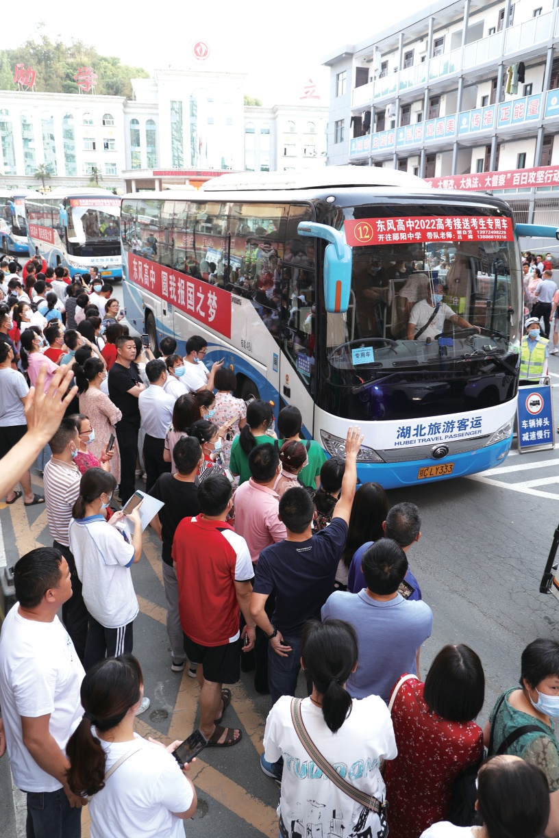 東風(fēng)高中的“少年戰(zhàn)士”踏上高考的征程。車(chē)身上的標(biāo)語(yǔ)“圓我報(bào)國(guó)之夢(mèng)”為孩子們的夢(mèng)想做了最好注解。