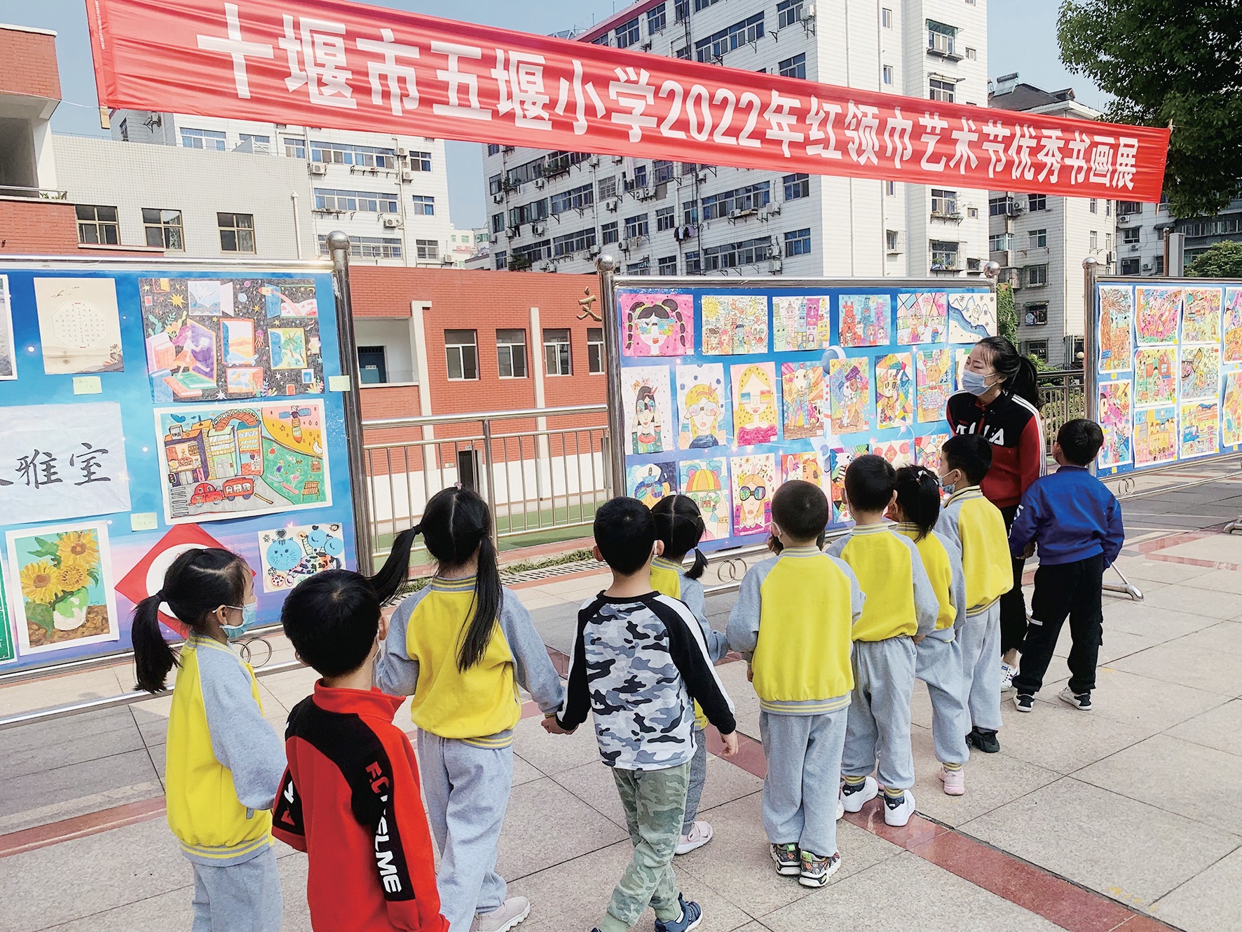 幼兒園大班孩子參觀小學(xué)校園。