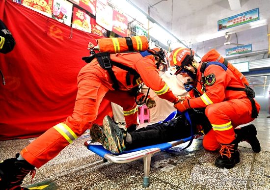 此次演練模擬上窯新安綜合批發(fā)市場(chǎng)A區(qū)一門面因使用取暖器引燃窗簾而引發(fā)火災(zāi),火勢(shì)迅速蔓延,形成大面積火災(zāi),火勢(shì)封閉疏散通道,有2人被困。