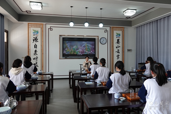 英山地處大別山南麓,是湖北省綠茶主產(chǎn)區(qū)之一。據(jù)悉,英山一中的每位學(xué)生在校期間要完成6個課時的茶藝課程,其中3節(jié)課用來學(xué)習(xí)理論知識,包括茶的起源、分類、中國茶文化,以及基本的茶藝禮儀,另3節(jié)課則進行全套茶具實操訓(xùn)練,完成一個完整的茶藝表演。