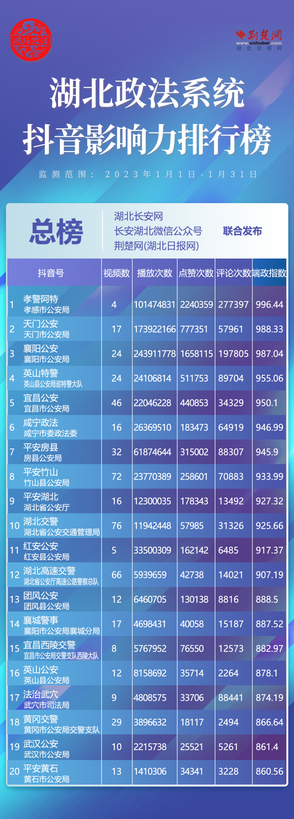 湖北政法系統(tǒng)370個抖音帳號參加評選,其中政法委系統(tǒng)82個、法院系統(tǒng)52個、檢察系統(tǒng)8個、公安系統(tǒng)195個、司法系統(tǒng)33個?!坝⑸教鼐?、“紅安公安”、“團(tuán)風(fēng)公安”、“英山公安”、“法治武穴”、“黃岡交警”6家單位強(qiáng)勢上榜,分別排名第4位、11位、13位、16位、17位、18位。
