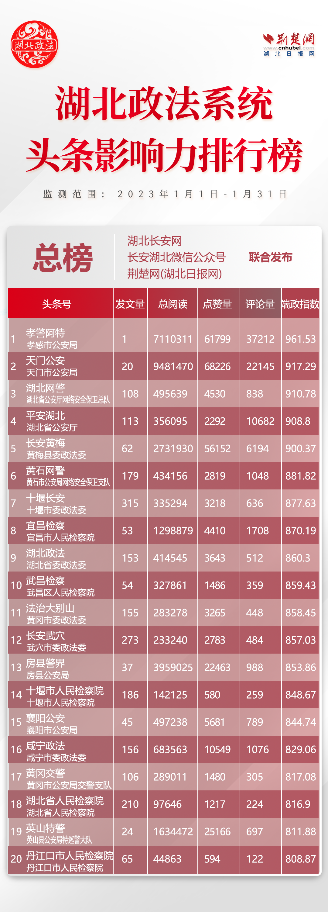 湖北政法系統(tǒng)681個頭條帳號參加評選,其中政法委系統(tǒng)123個、法院系統(tǒng)128個、檢察系統(tǒng)130個、公安系統(tǒng)141個、司法系統(tǒng)159個?!伴L安黃梅”、“法治大別山”、“長安武穴”、“黃岡交警”、“英山特警”5家單位強(qiáng)勢上榜,分別排名第5位、第11位、12位、17位、19位。