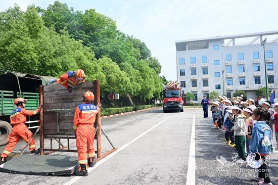 同時,全體師生觀看了攀爬繩索上樓、翻越障礙板、液壓鉗夾乒乓球、無齒鋸切割鋼絲等項目,感受消防員日常訓練、生活。更讓他們激動的是,孩子們在消防叔叔的保護下乘坐登高平臺車體驗了呼嘯云端救人的驚險,真是過足了一把當“小小消防員”的癮,火熱的太陽也絲毫阻擋不了師生們了解消防、體驗消防、點贊消防的熱情。