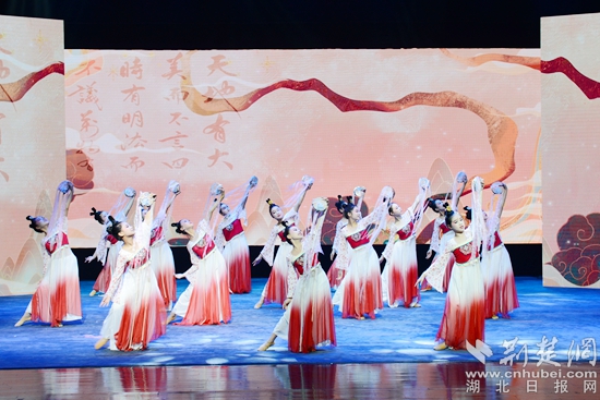 舞蹈《且吟春雨》《看了你一眼》婀娜曼妙,韻味十足。舞蹈《把愛寄回家》纏綿婉轉(zhuǎn),真情再現(xiàn)了一群留守兒童收到父母的快遞,思念父母的情景,表達(dá)留守兒童的心聲和期盼,呼吁社會給予他們更多的關(guān)愛。舞蹈《楚鼓聲聲》鏗鏘有力,再現(xiàn)了泱泱大國威武雄風(fēng)。