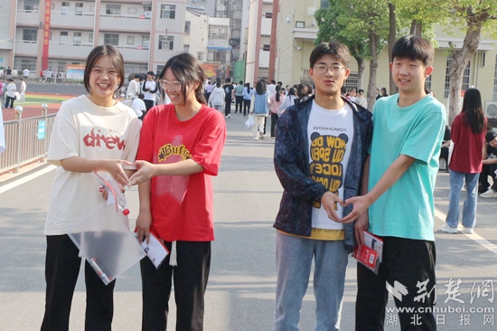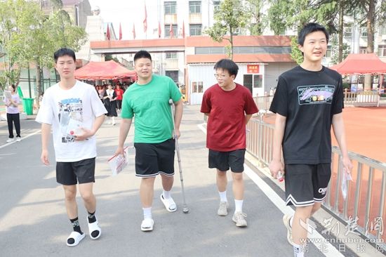 他們當(dāng)中有的考生身穿紅色衣服,預(yù)??荚嚧蠼?;在進(jìn)考場(chǎng)前,有的考生圍在一起,擺出愛心的手勢(shì),露出自信的笑容,高呼“戰(zhàn)勝高考,我能,我一定能”的口號(hào)響徹云霄;有的考生雖然在考前腿部或頭部受傷,但他們沒有顯示畏懼的神態(tài),反而展現(xiàn)了更堅(jiān)強(qiáng)的毅力與一往無前的勇氣,面帶笑容,堅(jiān)定地邁入考場(chǎng)……一幕幕從容的畫面詮釋著勇毅前行,一張張自信的笑臉展示著超越自我。