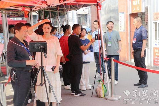 現(xiàn)場(chǎng),考生排著整齊的隊(duì)伍,接受考點(diǎn)身份驗(yàn)證及安檢檢查,陸續(xù)步入考場(chǎng)。