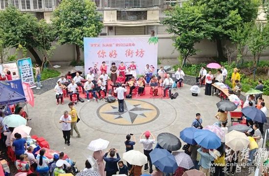 攤位前方,濠塘社區(qū)“藝家協(xié)會”的文藝志愿者們?yōu)榇蠹規(guī)砹司始姵实墓?jié)目,京劇《紅燈記》、《沙家浜》喚起居民的紅色記憶,小品《老倆口逛鄂州》帶大家回顧了鄂州的發(fā)展巨變,贏得大家陣陣掌聲。