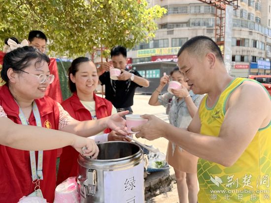 活動現(xiàn)場,社區(qū)工作人員在菜市場路口提前設(shè)置好清涼桌,將準備好兩大桶的綠豆湯和涼茶,發(fā)放給高溫下的工作者和路過的居民。同時,為他們科普防暑降溫知識,叮囑他們注意休息和避暑。