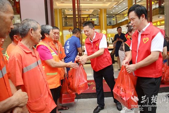 荊楚網(wǎng)(湖北日報網(wǎng))訊(通訊員 曹競帆 張萍)“這個愛心大禮包太實用了?!?月19日,在黃梅縣“愛心冰柜 清涼梅城”新時代文明實踐志愿服務(wù)活動啟動儀式上,拿到裝有水果罐頭、綠豆的防暑降溫禮包后,該縣黃梅鎮(zhèn)環(huán)衛(wèi)工人吳大姐微笑著豎起大拇指,“有了這些‘愛心冰柜’,我和工友們以后補水就很方便了!”