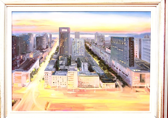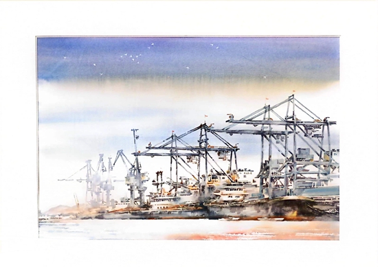 第一幅畫,展示的是數(shù)只船舶在新港碼頭裝卸貨物的繁華景象。第二幅畫,卡車進(jìn)入棋盤洲綜合保稅區(qū)外卡口的實景記錄。第三幅畫,描繪的是園區(qū)夜間工廠燈火通明、24小時生產(chǎn)不停的場景。第四幅畫,以綠色為底色,展示的是人與自然和諧共生的美景。第五幅畫,描繪的是棠梨湖商業(yè)街的街景。