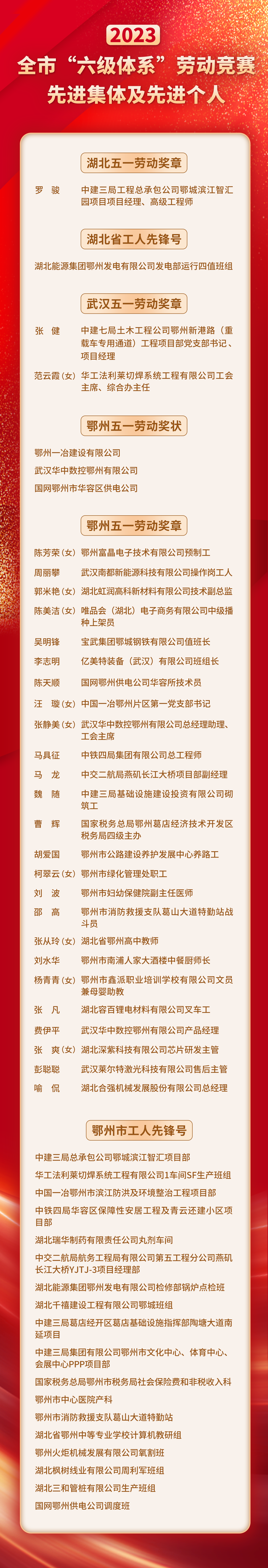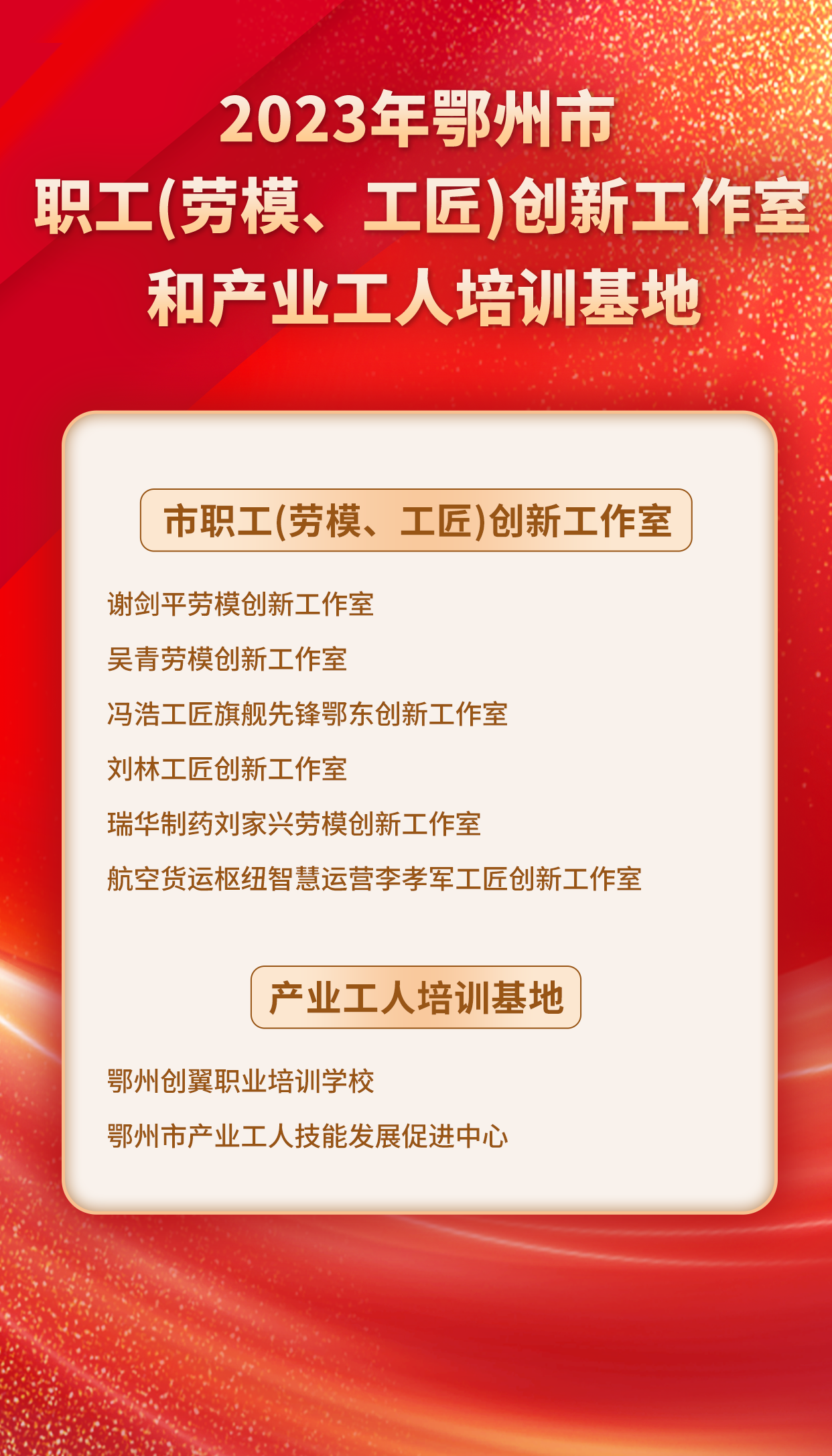 4月22日上午,在2024年鄂州市雙“百千萬”勞動和技能競賽啟動式上,鄂州公布2023年全市“六級體系”勞動競賽先進集體及先進個人名單,并公布2023年鄂州市職工(勞模、工匠)創(chuàng)新工作室和產(chǎn)業(yè)工人培訓基地。