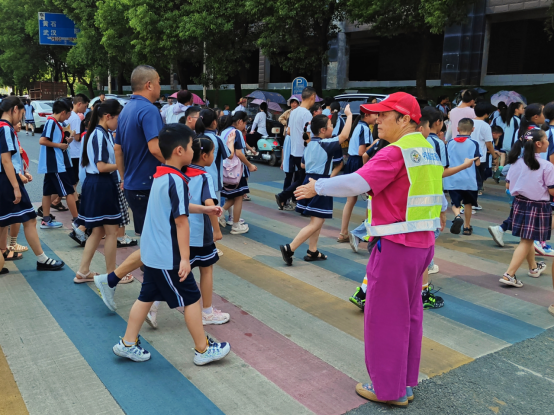 5月28日,烈日當(dāng)空,大冶濱湖學(xué)校門口,隨著宋慶莉的手勢(shì),汽車長(zhǎng)龍緩緩?fù)O隆0唏R線前,一隊(duì)學(xué)生有序過(guò)馬路。