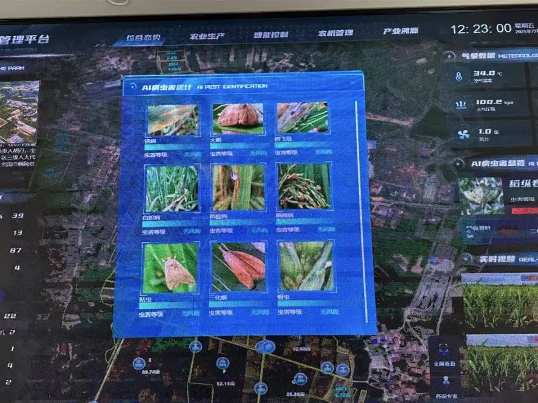 置身田間,每隔10畝地就佇立著一盞太陽(yáng)能滅蟲(chóng)燈。農(nóng)場(chǎng)控制室的智慧大屏上,害蟲(chóng)種類、病蟲(chóng)害風(fēng)險(xiǎn)預(yù)警等信息一覽無(wú)余。