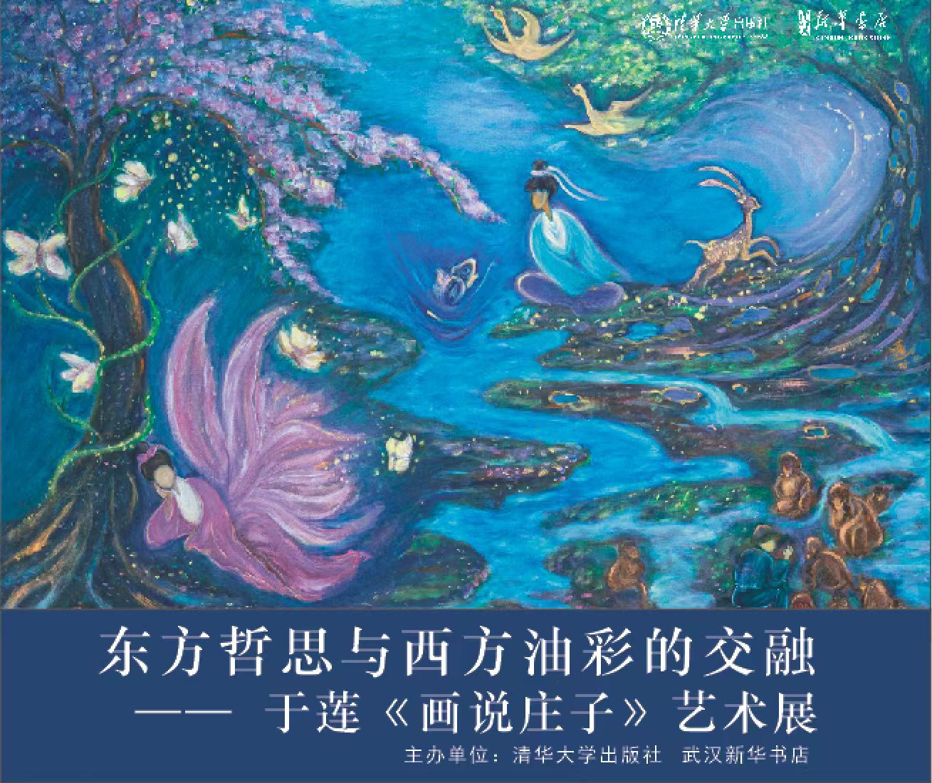 清華大學出版社特邀當代藝術(shù)家于蓮,耗時三年創(chuàng)作 27幅莊子主題油畫,以中西合璧的筆觸詮釋“天人合一”哲學。巨幅三聯(lián)畫《鯤鵬之變》用漸變的藍紫色調(diào)展現(xiàn)莊子的宏大宇宙觀,四聯(lián)畫《至樂》則以明麗色彩解構(gòu)生死命題。