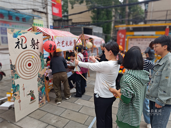 游戲互動區(qū)氛圍熱烈?!吧涓膊轮i”攤位前,居民踴躍參與,猜中謎底者可獲贈汪玉霞蘇月餅;“投壺納福”吸引眾人一試身手,在趣味中感受古禮韻味;“福來套圈”則準(zhǔn)備了洗衣液、透明皂等實(shí)用獎(jiǎng)品,深受居民喜愛。此外,“六藝禮射”項(xiàng)目讓居民親身體驗(yàn)傳統(tǒng)射藝,在拉弓搭箭間感受古人的尚武精神與禮儀風(fēng)范。