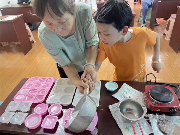 梅花苑社區(qū)居民動手制作月餅手工皂。 通訊員供圖