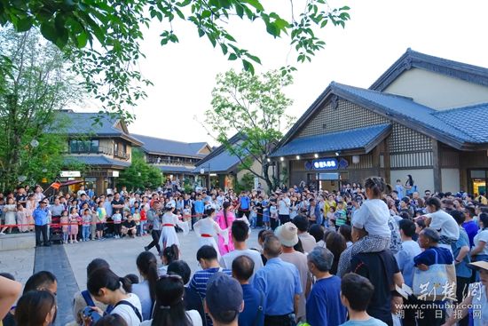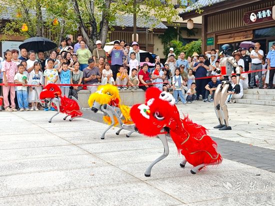 白天,智能機器人登臺唱起經典黃梅戲,聲聲入耳;靈活的機器狗躍動翻騰,引得觀眾連連喝彩。機器人巡游隊伍更是“身懷絕技”,握手、跳舞等表演樣樣在行,游客爭相互動合影。